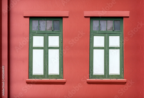 © chaophrayaart, Fototapeta premium Traditional windows on bright red walls