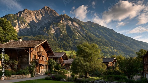© irawan, Fototapeta premium Traditional wooden alpine chalets nestled at the base of a massive, sunlit mountain range