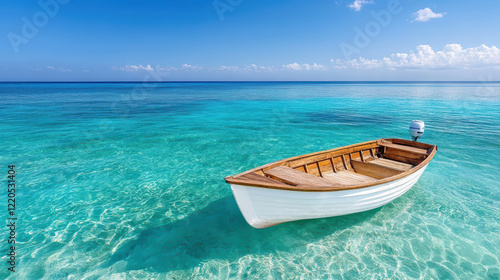 Naklejka premium traditional wooden boat anchored in calm turquoise bay, reflecting serenity