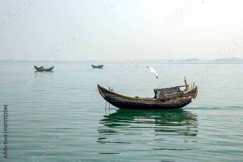 © Feriwala, Naklejka premium Traditional Wooden Boats Sailing on Calm Lake Under Clear Sky