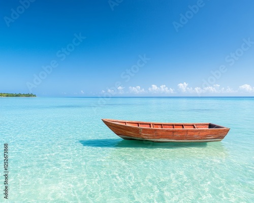 © Manganese, Naklejka premium Traditional Wooden Fishing Boat Anchored in Tropical Waters