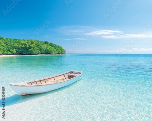 © Manganese, Naklejka premium Traditional Wooden Fishing Boat Anchored in Tropical Waters