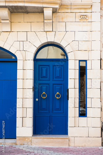 © salajean, Naklejka premium Traditional wooden painted blue door in Malta