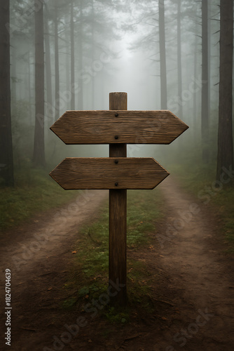 © Koushik, Fototapeta premium Traditional wooden signpost with two blank arrows on a fork in a dirt road leading through a misty pine forest representing divergent paths and life choices