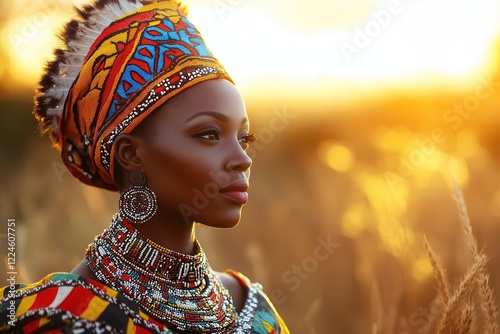 Fototapeta premium traditional zulu warrior princess in vibrant beaded ceremonial attire, adorned with intricate patterns and symbolic jewelry, photographed against african savanna at golden hour