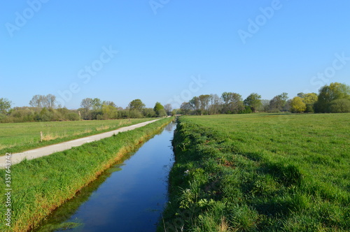 © Claudia Paul, Naklejka premium Traditionelle Niederrhein-Landschaft bei Grefrath-Oedt mit Feldern, Wanderweg und Entwässerungskanal