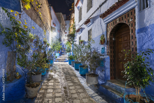 Naklejka premium Tradycyjne i typowe marokańskie detale architektoniczne w Chefchaouen, Maroko Afryka Wąska i piękna ulica błękitnej medyny z niebieskimi ścianami i ozdobiona różnymi przedmiotami. Ładne drzwi, okna