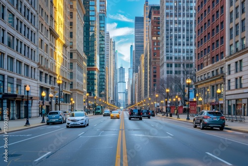 Naklejka premium Traffic flows along a lively downtown Chicago street lined with skyscrapers,...