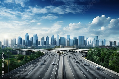 © Vilaysack, Fototapeta premium Traffic in the city at sunset. generative ai