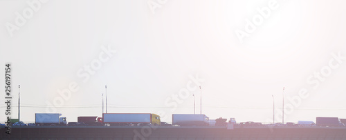 © ANGHI, Fototapeta premium Traffic jam on the bridge at sunset, panoramic view. Transport background