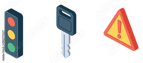 Fototapeta premium Traffic light, key, and warning sign icons on white background