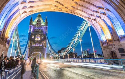 © jovannig, Obraz premium Traffic lights at night on Tower Bridge traffic, London - UK