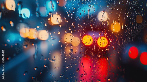 Obraz premium Traffic lights glowing through the raindrops on a wet window, creating a...
