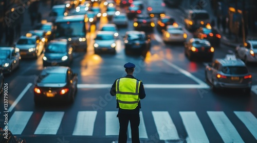 Obraz premium Traffic officer controls busy city road intersection during evening rush hour