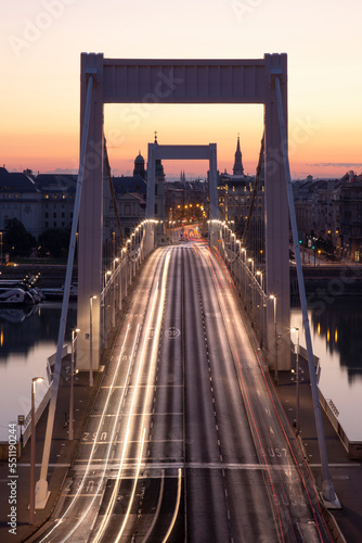 Fototapeta premium traffic on the bridge at sunrise in budapest