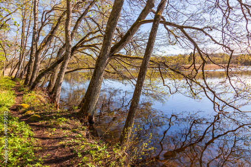© Lars Johansson, Obraz premium Trail by a lake with leaning trees at the water's edge
