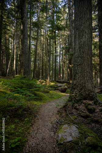 Fototapeta premium Trail Climbs Small Hill Through Mossy Forest In Glacier