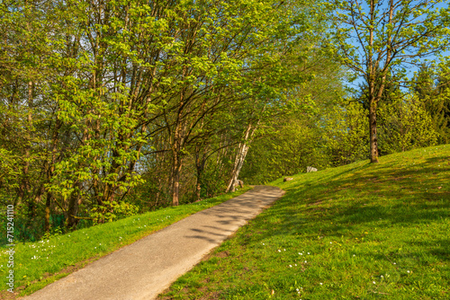 © karamysh, Naklejka premium Trail in Park with Wooden Path on Fall in Vancouver, Canada.