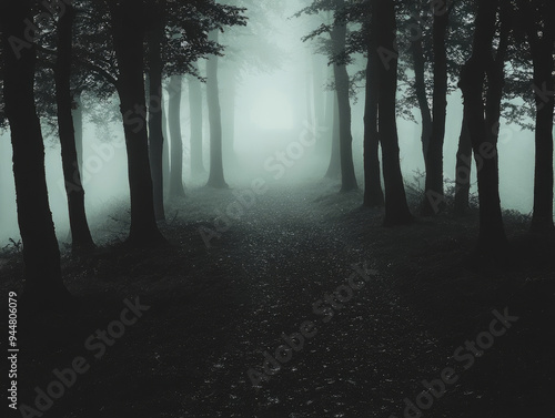 Naklejka premium Trail in the mystic forest with fog