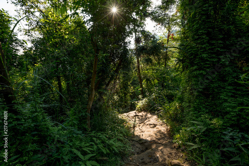 Fototapeta premium Trail in tropical green forest with ray of sunrise light