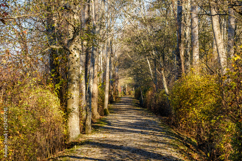 © Yi, Naklejka premium trail inside forest with sunlight hitting the ground through the foliage on an autumn morning