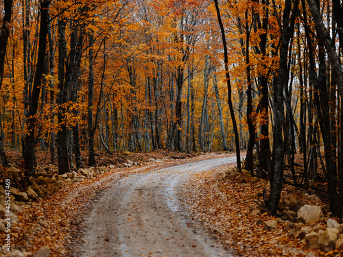 Obraz premium trail of yellow leaves autumn forest fresh air tall trees nature