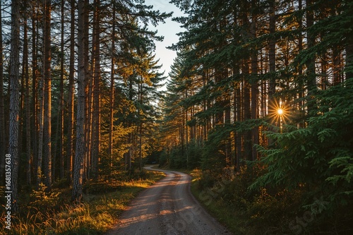 © vxnaghiyev, Fototapeta premium Trail through a dense evergreen forest at dusk in a protected northern woodland area.