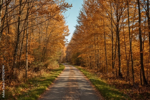 © AkuAku, Naklejka premium Trail through a fall woodland scene, journey into a natural meadow, promoting tranquility with an eco-friendly setting, ideal for wellness and a liberated way of living