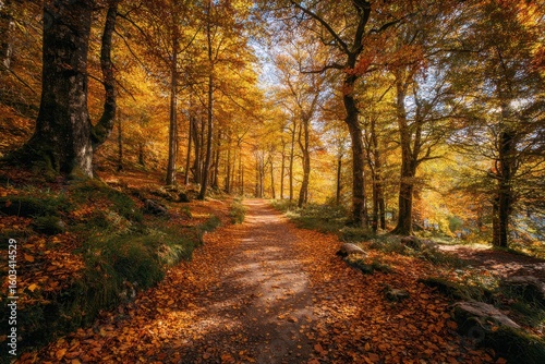 © Helpi, Fototapeta premium Trail through Autumn Forest Light filters through trees; idyllic path for hiking