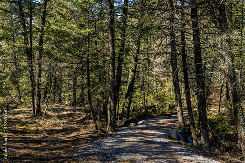 © olegmayorov, Fototapeta premium trail through forest in shade with tall green trees.
