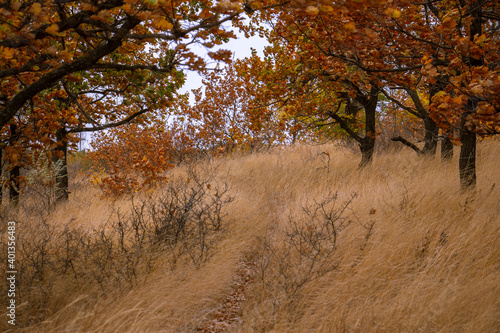 © Leo, Obraz premium trail through the autumn forest high on the mountain