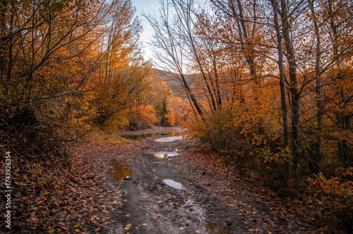 © Cyber Shutter, Obraz premium Trail Through the Fall Woods with Puddles and Rough Terrain