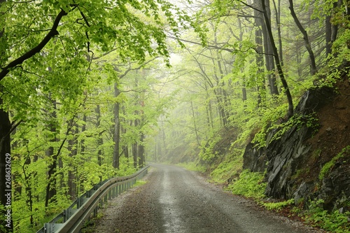 © Aniszewski, Obraz premium Trail through the spring deciduous forest in foggy rainy weather