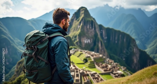 Naklejka premium Trailblazer male hiker exploring Machu Picchu, Peru in cool blues and grays....