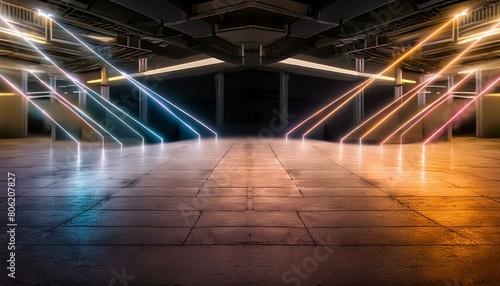 Fototapeta premium trails on the bridge, "Void Illumination: Neon Lights & Concrete Floors"