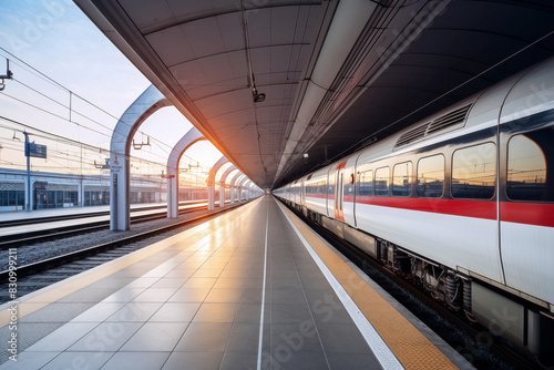 © ako-photography, Obraz premium Train Arrival at Platform. Background with selective focus and copy space.