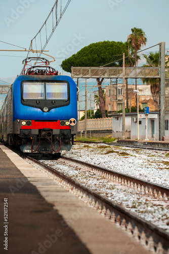 Naklejka premium Train arrives at regular rural train station in Italy.