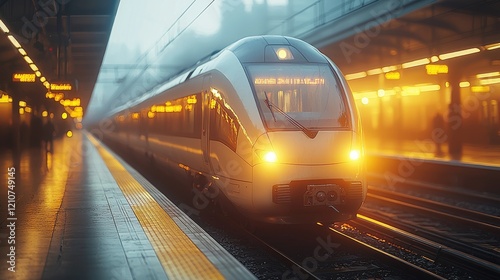 Fototapeta premium Train arriving at a foggy urban station during evening hours with glowing...