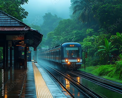 © Ardhana, Fototapeta premium Train arriving at a tropical rain forest station.