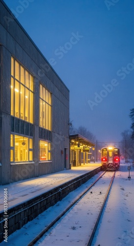 © AlIKY, Obraz premium Train arriving at snowy station platform during winter evening