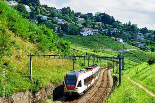 © Roman Babakin, Naklejka premium Train at railroad on Lavaux Vineyard Terraces