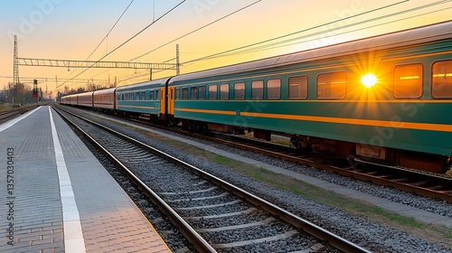 © bismillah, Naklejka premium Train at sunset on railway platform.