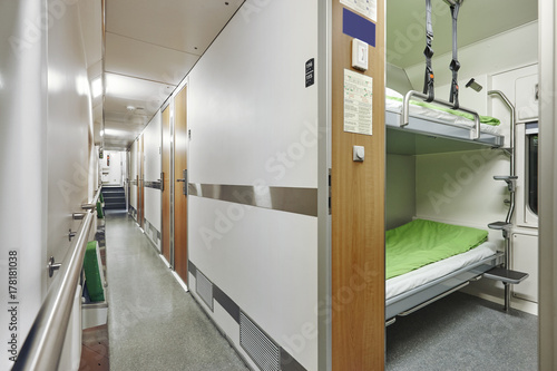 © h368k742, Naklejka premium Train berth vorridor indoor with two beds. Travel background.