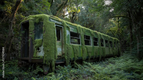 Naklejka premium Train car in the grass, overgrown vegetation, image of thickets, nature photography, game-like atmosphere, post-apocalypse.