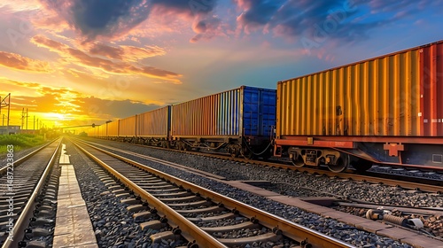 Fototapeta premium Train Carrying Containers Along Railroad Tracks During Sunset with Golden Sky