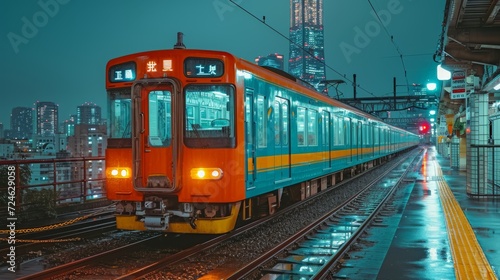 Naklejka premium "Train coloré à quai la nuit, atmosphère calme et industrielle"