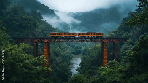 © Design By Reiga, Fototapeta premium Train crossing misty valley bridge
