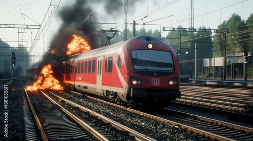© Sirichat. Camphol, Fototapeta premium Train fire incident railway station news report urban environment side view emergency response analysis