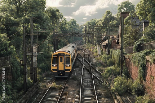 Naklejka premium Train Forest Railway Transportation Nature Journey Travel Adventure Scenic Route Green Trees Landscape Public Transport Commute Peaceful Serene