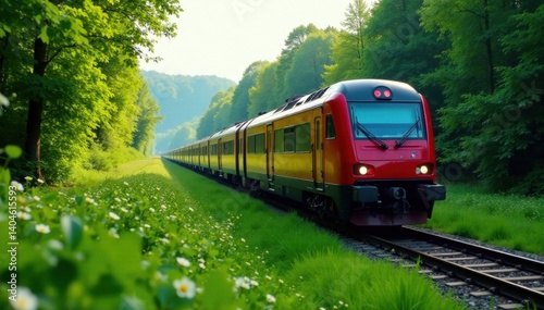 Naklejka premium Train gliding through vibrant green, tranquil scene , quiet, leaves, summer